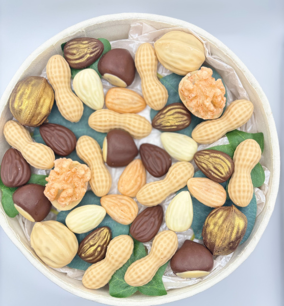 Noix : chocolat blanc, caramel de lait concentré, beurre de noix cruchy.